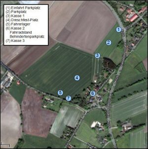 Parkplätze sind ausreichend auf der eingezeichneten Fläche (2) vorhanden. Behinderten-Parkplätze befinden sich an der Kasse (6) direkt beim Vielstedter Bauernhaus. Ein Fahrradstand befindet sich auch dort. Die Kirchkimmer Straße sowie der Nabbenkamp sind absolute Parkverbotszonen. Der Nabbenkamp ist komplett gesperrt. Hier kommen nur Traktoren und sonstige Teilnehmer durch.